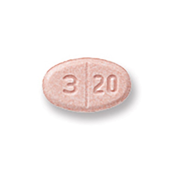 - Peach, oval, flat, beveled edge, uncoated tablet, RDY/3|20