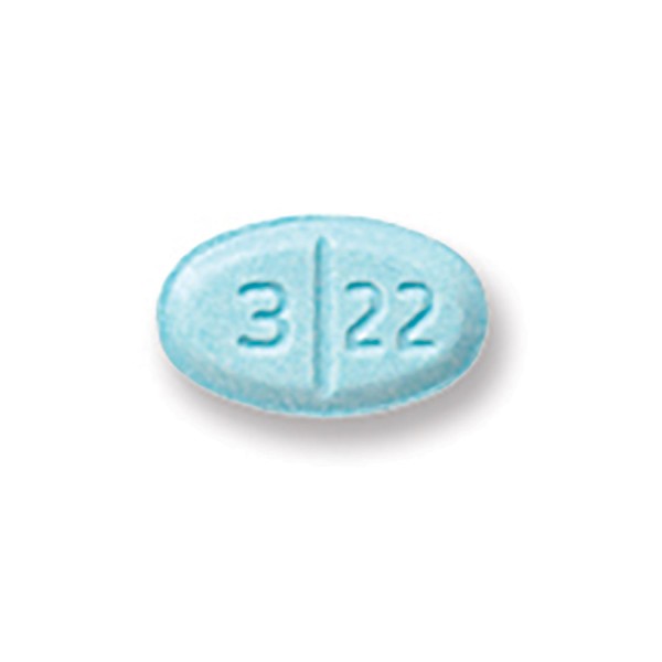 - Blue, oval, flat, beveled edge, uncoated tablet, RDY/3|22